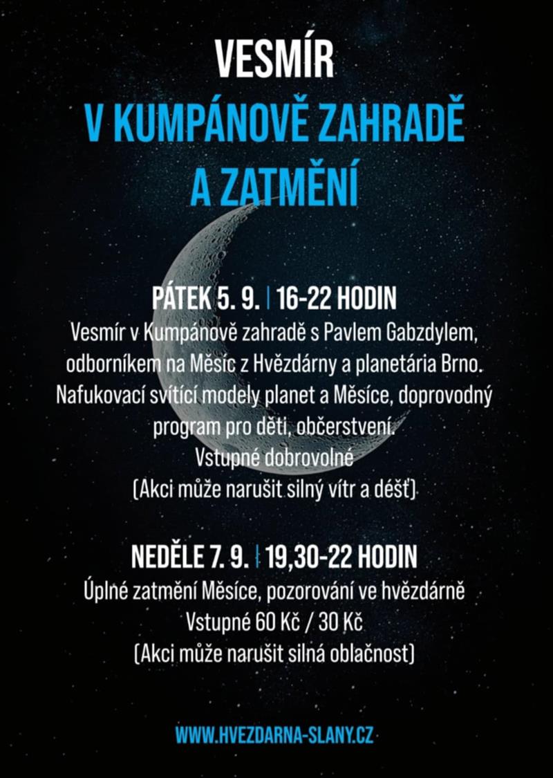 Již v pátek 5. září od 16h do 22h se můžete těšit na oblíbenou akci v Kumpánově zahradě, kde budeme mít nafukovací vesmírné modely, po setmění budou krásně svítit. Můžete se těšit na povídání nejdříve pro menší a později pro starší milovníky vesmíru od odborníka nejen na Měsíc Pavla Gabzdyla z brněnské hvězdárny a planetária. Pro děti je připraven doprovodný program s tvořením a pokusy, občerstvení bude zajištěno též. Vstupné dobrovolné. Akci by mohl ohrozit pouze silný vítr a déšť.